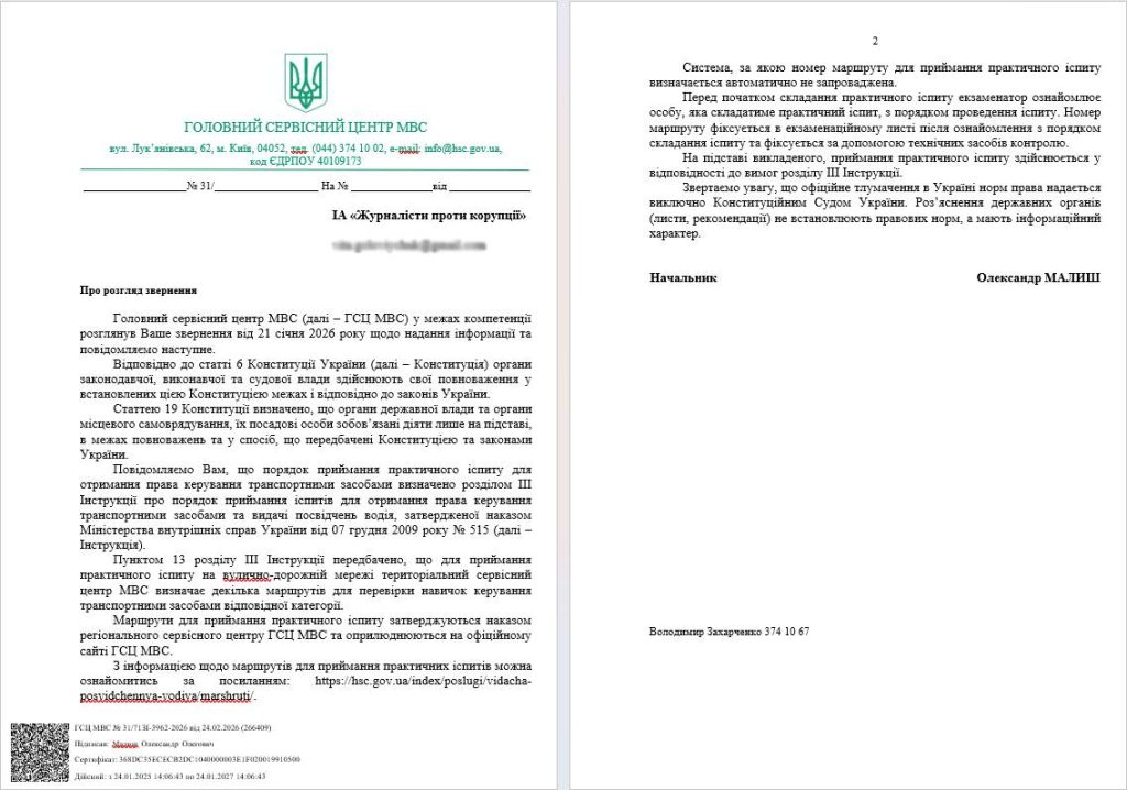 Кілька місяців тому у сервісних центрах МВС перед початком практичного іспиту в екзаменаційних листах почали зазначати номер маршруту. Багато кандидатів на отримання посвідчення водія сприйняли це як ознаку запровадження автоматичної системи розподілу маршрутів, яка мала б унеможливити суб’єктивний вплив на вибір маршруту та забезпечити однакові умови складання іспиту для всіх. Щоб з’ясувати, чи справді номер маршруту визначається автоматично та чи існує нормативно встановлений порядок такого розподілу, було направлено запит на отримання публічної інформації до Головного сервісного центру МВС. У відповіді на цей запит ГСЦ МВС підтвердив: автоматизованої системи визначення маршруту під час складання практичного іспиту наразі не запроваджено.
